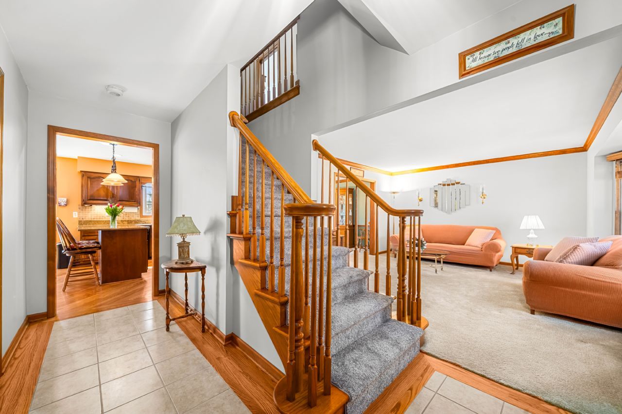 OPEN & AIRY! Fresh space, natural light, and an open layout designed for gathering, this well loved, 4-bedroom, 2 1/2-bath home with basement and heated 3 car garage offers plenty of room to live and grow. From the covered front porch to the tiled entry, guests will feel a warm welcome once inside. Highlights include an oversized family room with a beamed vaulted ceiling anchored by a bold brick fireplace surrounded by a wall of sunshine to brighten the day. The open design flows into the spacious eat-in kitchen featuring beautiful hardwood floors, granite countertops, tiled backsplash, a center island with breakfast bar, pantry and generous table space overlooking the backyard. The main level also offers a bayed living room and dedicated dining room both with crown molding - perfect for hosting holidays, celebrations, or everyday moments. The main level laundry with storage includes the washer & dryer. Upstairs, the owner's suite shines with a stunning modern luxury spa bathroom (2022) featuring a large glass tiled shower and vanity tower with double bowl sinks creating a true retreat for relaxation. Three additional generous sized bedrooms provide flexibility for family, guests, or home office needs. The main bath features a newer skylight and new sink. The ready-to-finish basement with cement crawl gives excellent storage and future living space potential. Step outside to enjoy the extended maintenance-free TREX deck (2024) and open yard - just waiting for warm weather gatherings and summer evenings. The included air compressor and heated 3/car garage provide lots of space for a car enthusiast. A NEW roof, vinyl siding, skylights, gutters & downspouts (2023), landscaping (2024), refreshed hardwood floors (2025), windows (2016), & water heater (2022) provide added value to this well cared for home. Step into Spring and start your new home chapter!